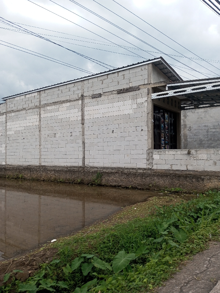 An exterior scene in Khajuripada, India, depicts an unfinished building adjacent to a murky water body under an overcast sky. The building, constructed with light-colored concrete blocks, features visible vertical concrete support beams and a dark-colored pitched roof section on the right. A recessed entrance area with a dark, multi-paneled door is present, covered by a light-colored metal frame canopy. Exposed wooden elements are visible along the upper portion of the building's left wall. The water body, likely a canal or flooded field, runs parallel to the structure and reflects its image. On the viewer's side, a strip of dense green vegetation, including broadleaf plants, borders the water. A narrow paved surface is visible on the far right. Multiple black electrical or communication lines crisscross the grey, cloudy sky overhead. No individuals are present.