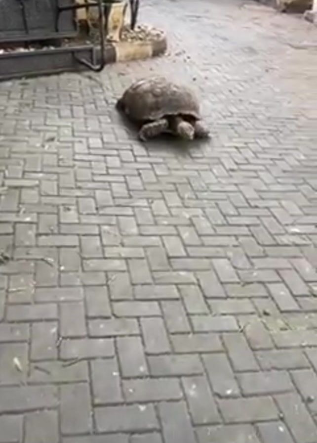 tortoise on a brick-paved surface, likely a driveway or patio. The tortoise is medium-sized with a mottled grey shell and visible legs and head. There is scattered plant debris on the bricks. In the background, there is outdoor furniture, plants in pots, and sections of a building. The video appears to be filmed outdoors during daylight hours. The tortoise is moving slowly across the paved area.