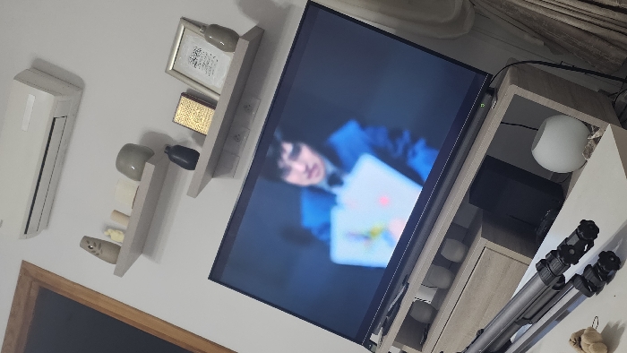 A tilted shot reveals a TV displaying a person wearing a blue outfit holding a white card with red and yellow circular elements. To the TV's left are wall-mounted shelves holding decorative items. An air conditioning unit is also visible on the wall. To the TV's right, there's a light-colored cabinet featuring a rounded lamp, a black speaker, and a tripod. A small, furry object rests on the floor near the tripod.