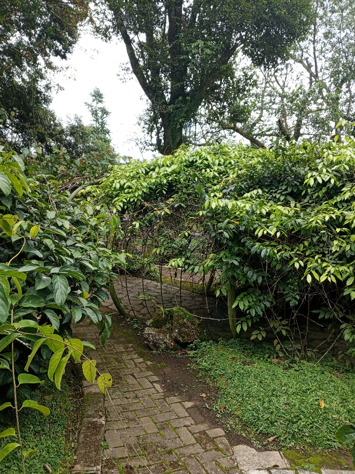 A brick pathway meanders through lush greenery, bordered by dense bushes and trees