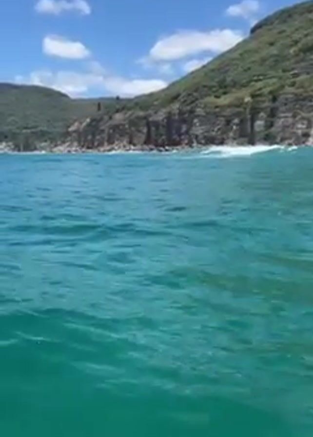 boat moving through the ocean on a sunny day. The water is a clear, turquoise color with small waves. In the background, there is a coastline with rocky cliffs covered in lush, green vegetation. The sky is blue with scattered white clouds.