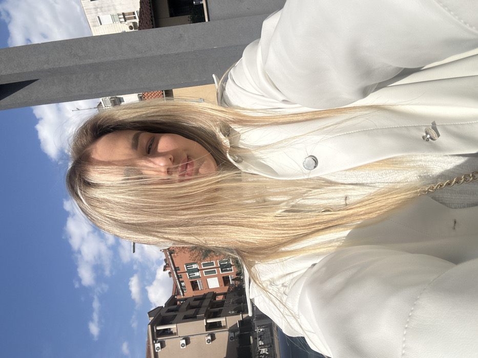 The image depicts a female individual taking a selfie in an urban outdoor setting. The subject, a female with long, straight blonde hair, is positioned centrally, with her hair partially covering the left side of her face. She is wearing a white collared jacket with silver-toned snap buttons over a light-colored, possibly off-white or light grey, ribbed knit top. A gold-colored chain, likely from a bag or necklace, is visible across her chest. Her eyes appear narrowed, and her lips are slightly pursed, possibly due to direct sunlight. The environment is brightly lit by direct sunlight, with a clear blue sky containing scattered white clouds overhead. In the background, multiple multi-story residential buildings are visible. To the left, buildings feature light-colored facades with numerous external air conditioning units. To the right, a building with a reddish-brown facade and white window frames is present. A large, dark grey, rectangular column or architectural element stands vertically on the right side of the frame, partially obscuring the background. A paved street or sidewalk is partially visible in the lower-left background. The architectural style and urban density suggest an urban area within Budva, Montenegro, though no specific landmarks allow for a more precise location within the city.