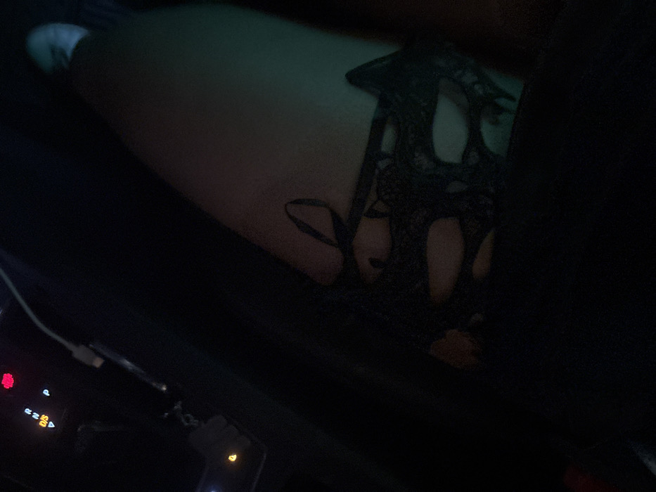 The scene is located within a vehicle in Komchén, Mexico. The interior is dimly lit, with visible light sources originating from the vehicle's dashboard. On the left side of the frame, an illuminated automatic transmission gear selector is present, displaying 'P' in red, 'R', 'N', and 'D/S' in orange, along with a distinct small yellow indicator light. A white charging cable is connected near the gear selector. The central and right portions of the image feature a bare human thigh, exhibiting skin tone under ambient light, which transitions to a greenish tint towards the upper right. A black, intricately patterned mask, suggestive of lace or cut-out material and possibly featuring cat-like ear protrusions, rests directly on the thigh. A black ribbon tie is visible near the top of the mask. A dark-colored fabric garment occupies the bottom-left foreground, partially obscuring the lower section of the mask.
