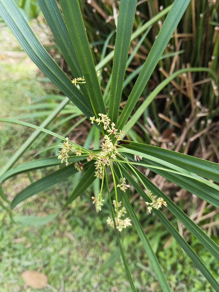 This image captures a close-up, slightly overhead view of a plant located in La Castellana, Philippines. The central subject is a vibrant green plant characterized by multiple long, slender, parallel-veined leaves radiating outwards. Interspersed among these leaves, particularly near the plant's center, are numerous small clusters of light green to beige inflorescences or seed heads. The background on the lower left exhibits blurred green grass, with a single dried, brown leaf partially visible. The upper right background consists of blurred brown and green linear elements, consistent with dry or sparse vegetation. No individuals, animals, or active movements are depicted. The scene is static and illuminated by natural light.