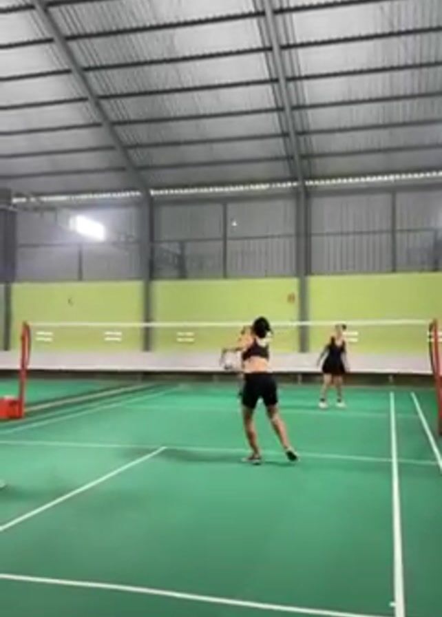 badminton game in progress. Four women, dressed in athletic wear, are playing on a green badminton court inside a large, covered gymnasium. The walls of the gym are light green with letters marking the different court areas. The gym has a high, corrugated metal roof. A man walks in front of the camera, briefly obscuring the view of the game. The game continues as the women hit the shuttlecock back and forth over the net.