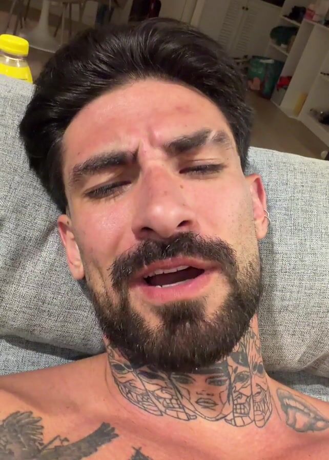 A man with a beard and tattoos is lying on a gray surface, perhaps a bed or couch. He has dark hair and a visible ear piercing. He's speaking and appears to be asking a question about a new update, possibly referring to software or social media. The background includes a glimpse of an interior space, including chairs and storage units.