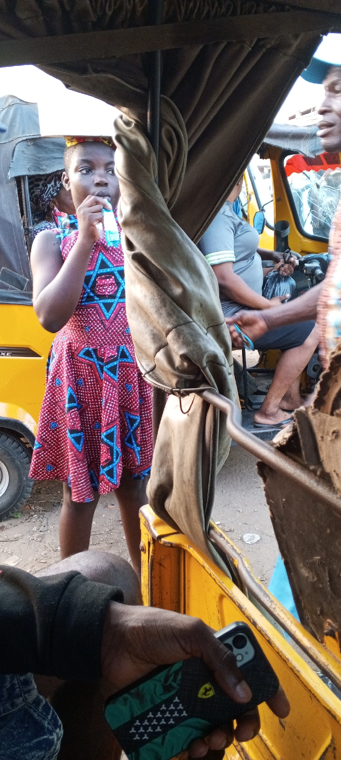 A young person in a red and blue dress drinks from a clear plastic bag. She is outside a yellow vehicle, likely a tuk-tuk. Inside the tuk-tuk, a person with a green and black phone case holds their device. The tuk-tuk's canopy is pulled back and draped. Another individual sits in the tuk-tuk behind the driver. A man stands on the right side of the tuk-tuk, partially visible.