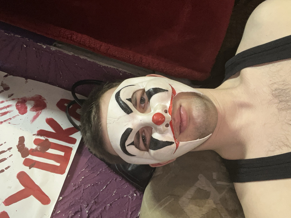 A male subject, located in the city of Saratov, Russia, is depicted in a close-up, chest-up indoor image. He wears a white, distressed half-mask covering his upper face, featuring a red circular nose, black painted eyebrows, and black teardrop-like markings under the eyes, with a red painted smile line. His lower face, neck, and upper chest are visible. He has short brown hair and wears a dark-colored tank top, revealing chest hair. The subject's eyes are visible through the mask's eyeholes. The subject appears to be taking a self-portrait. In the upper left background, a white sheet of paper or fabric displays red Cyrillic characters resembling "УШКА" (USHKA) and multiple red handprints. Below this sign, a textured purple surface is present. To the subject's left, a light-colored, textured cushion is visible. To the right, a dark, looped object is partially obscured by the subject's head, adjacent to a vertical section of dark red, textured fabric.