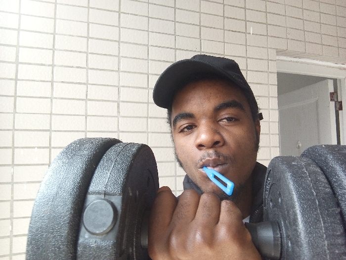 A man wearing a black baseball cap holds a dumbbell in each hand while posing. He has dark skin and a toothbrush in his mouth. He looks directly at the camera. The background consists of a tiled wall, likely the exterior of a building, with a door visible on the right side of the frame. The dumbbell weights appear black and have circular plates.