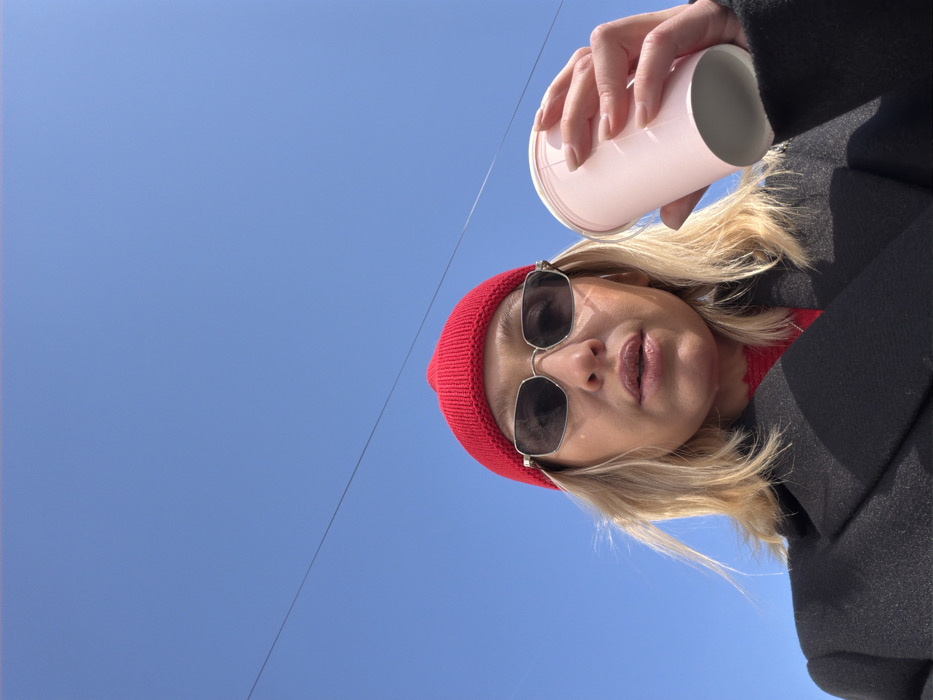 A low-angle outdoor portrait features an individual against a clear blue sky in Chaikovsky, Russia. The person, with blonde hair, wears a red knit beanie, silver-framed dark sunglasses, a red top, and a black overcoat. The right hand, adorned with natural-looking nails, holds a light pink paper cup. A single dark utility wire traverses the upper third of the bright blue sky. Bright sunlight illuminates the scene from the subject's right.