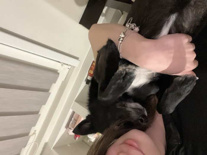 An indoor scene depicts a female subject holding a small-to-medium-sized dog