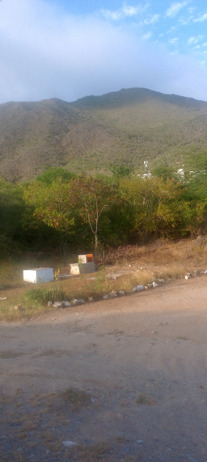 An outdoor scene in Juan Griego, Venezuela, features a dirt road traversing the lower portion of the image from right to left. To the left of the road, on slightly elevated ground, three rectangular concrete block structures are present: one is predominantly white, another is grey, and a third appears smaller with an orange-colored top. Sparse dry grass and small green plants are visible around these structures, with a line of white rocks bordering the road further to the right. A band of varied green and brown trees and dense scrub forms the midground, with a prominent, slender tree displaying reddish-green foliage centrally located. The upper half of the image is dominated by a large, vegetated mountain exhibiting dry, scrubland characteristics. On the mountain's slope, partially obscured by intervening trees, several white communication towers or antenna structures are visible. The sky above is light blue with scattered white, hazy clouds. No individuals or animals are present.