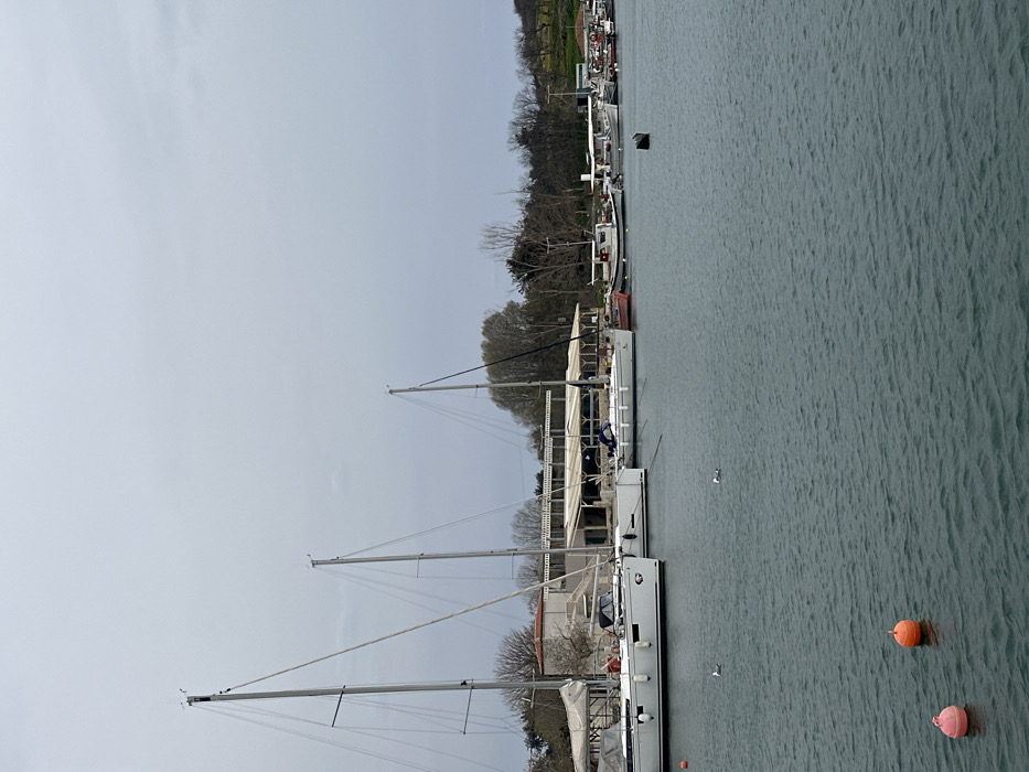 The scene depicts a marina in Limenas Avdiron, Greece, under an overcast sky. The upper third of the image is dominated by a uniform, light grey, cloudy sky. The lower two-thirds consists of dark teal-green water with a rippled surface. In the foreground, two spherical buoys, one pink and one orange, float in the lower-left. Mid-ground, a line of boats is moored along the shore. Three large white sailboats with tall, bare masts and visible rigging are prominent on the left and center-left. Their hulls are white, and some deck areas are covered with grey tarps. To the right of these sailboats, a series of smaller vessels are moored, including a red-hulled boat and several white fishing or utility boats. A black rectangular buoy floats in the water among these smaller boats. The shoreline features a light-colored building complex with a substantial white or cream-colored canopy structure extending over a patio area, suggestive of a restaurant or cafe. Behind and to the right of the buildings, deciduous trees, mostly bare or with nascent foliage, line the shore. A patch of green vegetation is visible on a gentle slope on the far right. Three white birds, likely gulls, are present; two are floating on the water in the mid-left foreground, and one is perched near the top of the leftmost sailboat's mast. No human figures are discernible. All boats are stationary and appear to be moored.