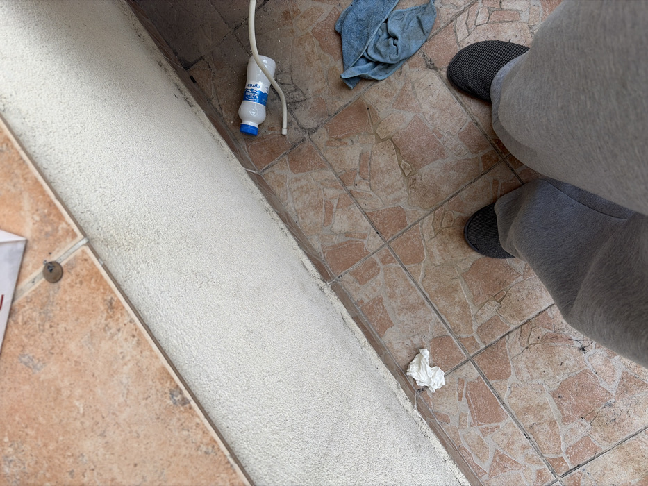 - "The image displays a first-person, downward-angled view of a person's lower legs and feet on a tiled surface, adjacent to a textured wall in Sofia, Bulgaria" by FM-NjaWW2, licensed under CC BY 4.0