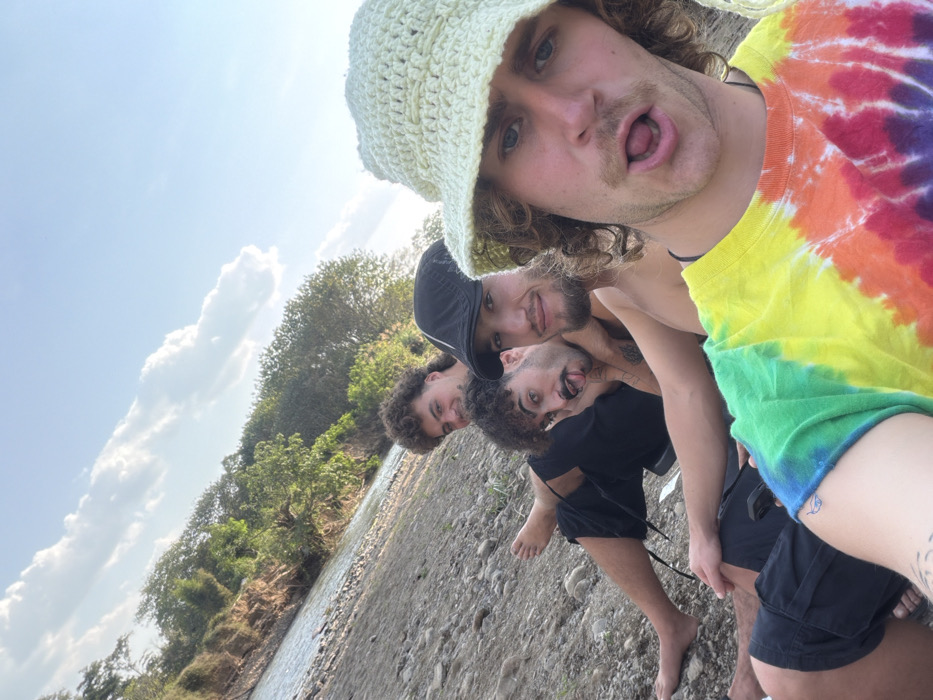 Four young adult males are positioned for a selfie on the rocky bank of the Pai River in Pai, Thailand, under a clear blue sky with scattered white clouds