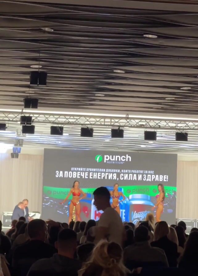 crowd of people seated in a large room watching a fitness competition. Three female contestants in bikinis are posing on a stage in front of a large screen displaying advertisements for "Punch Nutrition" and other companies. A person is seated to the left side of the stage, possibly a judge or commentator. The crowd seems engaged, with some people moving around and taking photos. The room has a high ceiling with many lights.