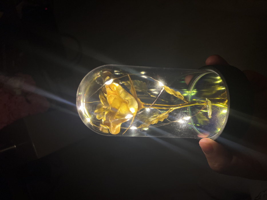 A human hand, consistent with an adult's, is visible in the lower left portion of the image, grasping the black circular base of a decorative item. The item consists of a clear, dome-shaped glass or acrylic cloche (bell jar) approximately 15-20 cm in height, encasing an artificial rose. The artificial rose is metallic gold in color, featuring detailed petals, a stem, and several leaves. Approximately 15 to 20 small, spherical LED lights, emitting a warm white glow, are strung around the rose and stem within the cloche. The black base of the cloche has a mirrored surface on top, which reflects the lights and the golden rose. The immediate environment is dimly lit, with the cloche itself serving as the primary light source. The background is dark and out of focus, providing no discernible details of the surrounding space. No other individuals or significant objects are identifiable. The scene is located in Kribul, Bulgaria.