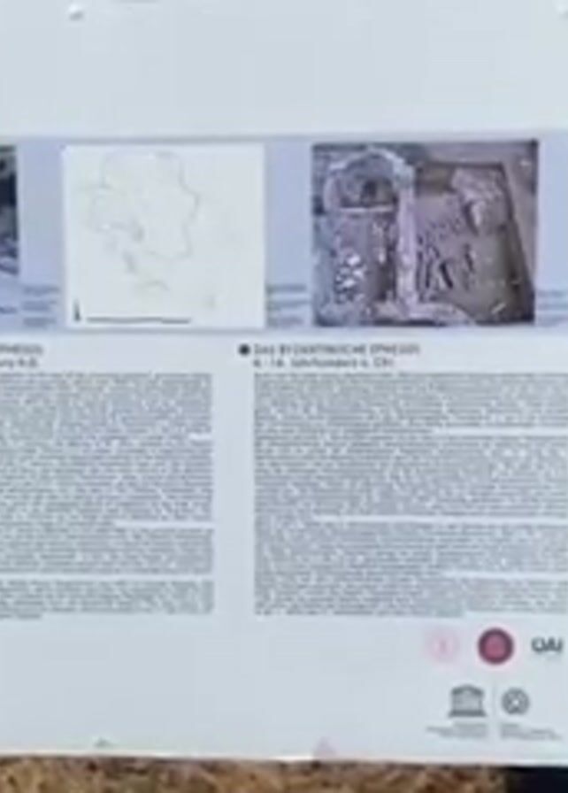 sign with information about the Byzantine Ephesus, which existed in the 4th to 14th century A.D. The sign has pictures and text in Turkish, English, and German. The video is shot outside, in an area with some grass and trees.