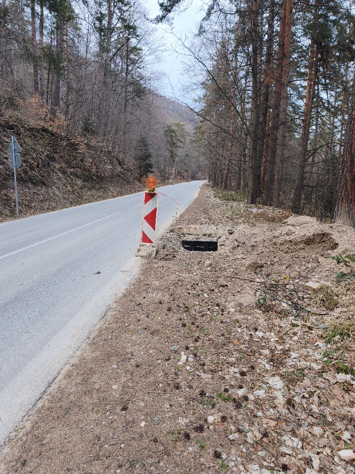 The image depicts a rural road scene in Sveti Konstantin, Bulgaria, characterized by a forested environment and infrastructure damage. The scene is devoid of human presence. In the foreground, a paved asphalt road extends into the distance, gently curving left. A solid white line marks the right edge of the road. On the immediate right shoulder, a red and white striped warning pole with a flashing amber beacon on top is positioned. A thin, red and white striped caution tape extends from the pole towards the right. Directly behind this pole, an open, rectangular, dark cavity is visible in the ground, consistent with a missing culvert grate or manhole cover. The ground surrounding this opening appears disturbed and consists of loose brown earth, pine needles, dry leaves, and small stones. Further to the right, beyond the open cavity, a mound of disturbed earth and debris is present. A dense line of tall coniferous trees with dark trunks and sparse foliage borders the right side of the road, extending into the background. On the left side of the road, a sloped hillside rises, covered by a mix of bare deciduous trees and some coniferous trees. A gray road sign with two circular elements is partially visible on a metal pole on the left shoulder. The ground on the slope is covered with dry leaves and sparse vegetation. The sky above the tree line is pale and overcast. No vehicles or individuals are present in the observable scene.