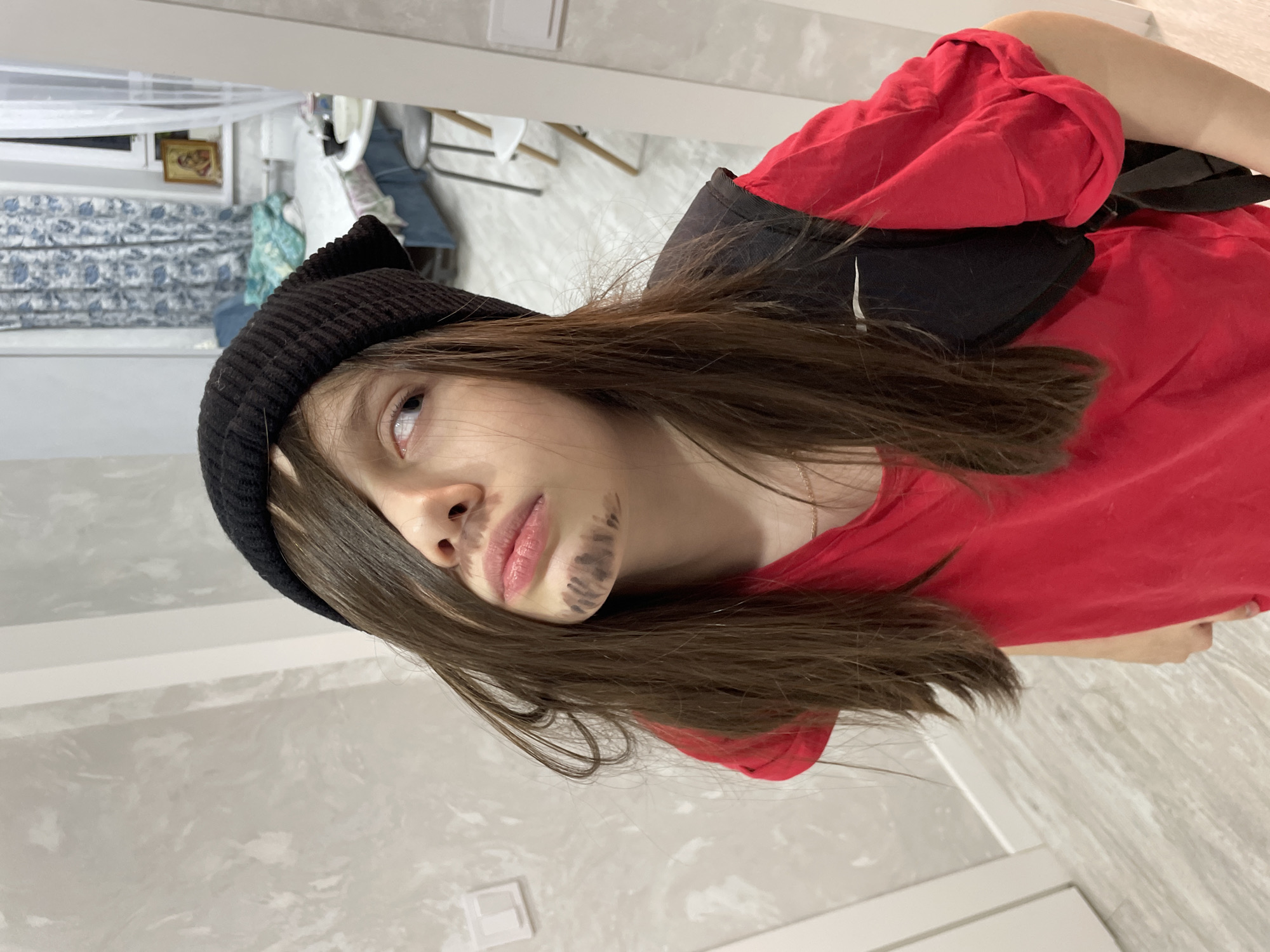 A young person wearing a black beanie and a red t-shirt is looking slightly upward to the left. There is a black strap or bag partially visible behind their shoulder. The person has dark hair that falls around their face. Smudges of a dark substance are present on their face around the chin and upper lip area. The background appears to be an indoor space with light-colored walls and trim, and glimpses of furniture and a window with patterned curtains can be seen. There is no identifiable sign of Izhevsk, Russia.
