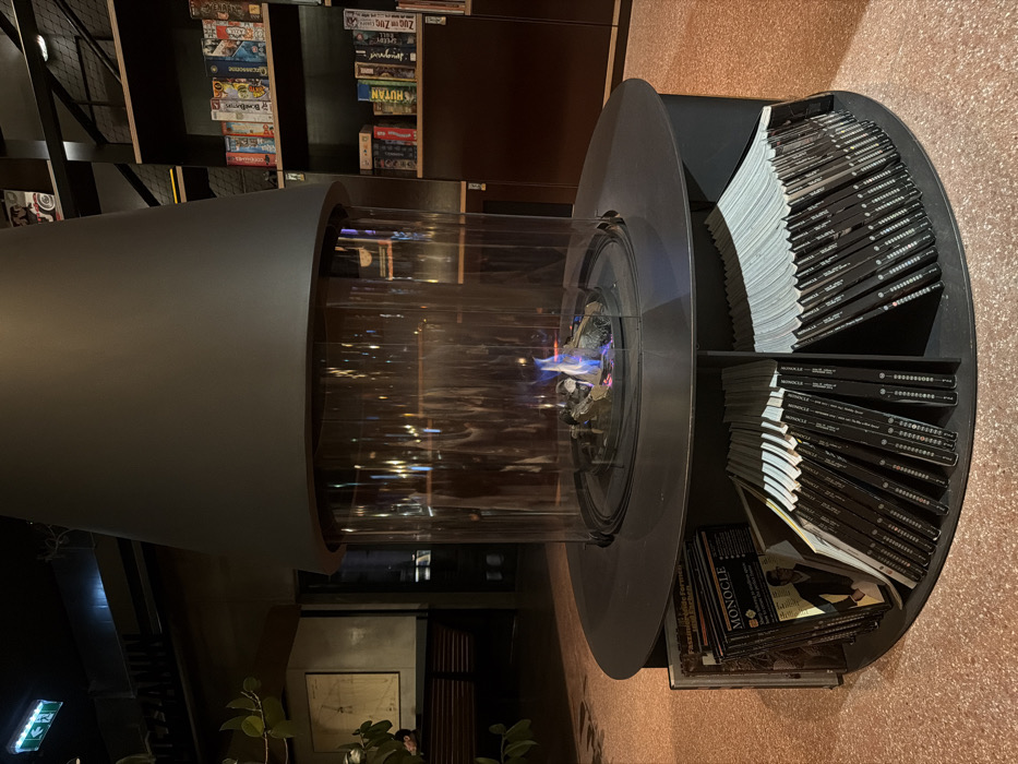 A cylindrical, modern fireplace stands beside shelves filled with games and books. The fireplace has a clear glass middle section showcasing a small blue flame. A circular shelf unit with magazines or books is attached to the fireplace's right side, with multiple copies stacked neatly. The floor has a speckled, beige pattern, contrasting with the fireplace's dark gray color. A glimpse of plants and interior furnishings can be seen in the background.