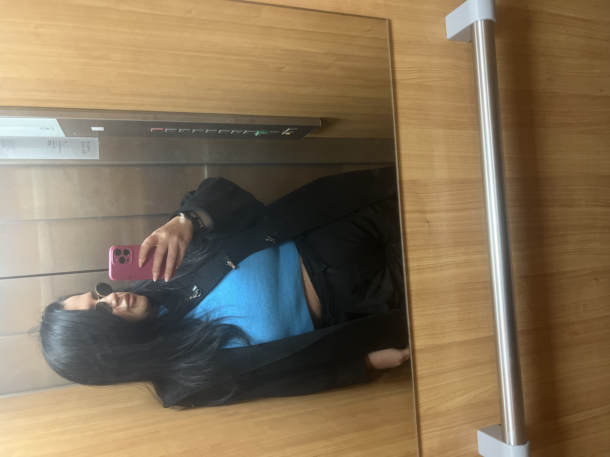 An individual, female, is captured in a mirror selfie within an elevator in Vienna, Austria. She possesses long, dark hair and wears dark, round-lensed sunglasses with thin, gold-colored frames. Her attire consists of a bright blue cropped top, a dark long jacket or coat, and dark trousers. A dark, possibly studded, bracelet adorns her left wrist. She holds a pink smartphone with a multi-lens camera array in her right hand, positioned to capture her reflection. Her fingernails are painted a light pink. The elevator interior features light-colored wooden veneer walls with vertical grain, contrasting with a reflective metal wall, likely stainless steel, on the left. This metal wall hosts a control panel with multiple gray buttons, one illuminated green and another red. An inverted information label displaying German text, including "350 kg" and a "CE" mark, is also affixed to the metal surface. A silver-colored metal handrail with white end brackets is visible horizontally across the lower portion of the wooden wall, reflected in the mirror.