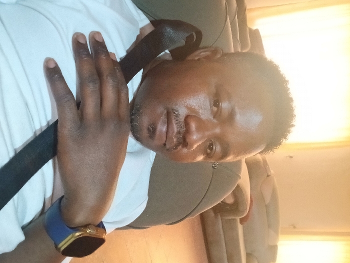 n adult male, appearing to be of African descent, seated indoors. He has short, dark, curly hair with faded sides, a short mustache, and a goatee. He is wearing a white short-sleeved t-shirt. A dark-colored strap, consistent with a seatbelt, diagonally crosses his chest. His right hand rests upon this strap. A wristwatch with a blue band and a gold-colored casing is visible on his right wrist. The background reveals a room with light-colored walls. Partially visible are two upholstered sofas or chairs of a light, neutral color. A prominent bright light source, possibly a window, is visible in the upper background, causing a glare. The overall lighting in the room is bright. There are no identifying visual markers within the image to confirm the specific location as Nata, Botswana, or any other city. The setting is a generic indoor residential or commercial lounge area.