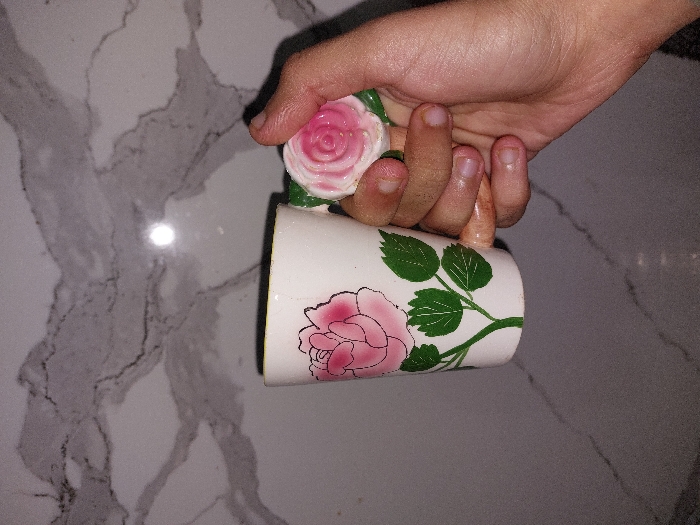 A hand grips a ceramic mug adorned with roses. The mug is mostly white, with a painted pink rose and green leaves on its side. The handle is shaped like a rose, also pink. The background is a light gray marble or tile surface with dark gray veins. The lighting appears to be indoor and somewhat dim.