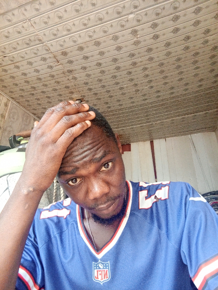 An adult male is positioned indoors, appearing in the foreground of a close-up, chest-up shot. He possesses dark skin, short dark hair, and a dark beard. His right hand is raised, fingers spread, resting on the top of his head. A silver-colored chain is visible around his neck. He wears a blue American Football jersey with red and white accents, featuring the NFL shield logo at the collar and partial white lettering/numbering (e.g., "LS" or "LL") on the upper left shoulder. A noticeable raised scar is present on his left forearm. The subject maintains direct eye contact with the camera. The background reveals an indoor setting with a light-colored ceiling composed of rectangular panels featuring a repeating, faded floral or scrollwork pattern; some panels show cracks and a small, dark circular hole. The rear wall consists of vertical paneling, possibly wood or painted boards, with a light green object partially visible on the left and stacked fabric or clothing on the right. The location is in the city of Unknown, Unknown.