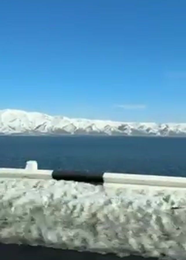 snow-covered guardrail, a body of water, and mountains covered in snow. The sky is clear and blue. The footage appears to be taken from a moving vehicle. The water is a deep blue.