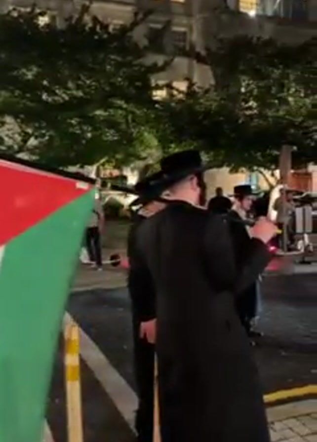 group of men dressed in traditional Orthodox Jewish attire, including black hats and coats, standing on a city street at night. There is a Palestinian flag displayed on the sidewalk. A man in a blue shirt approaches the group and appears to be speaking with them. The background includes a large building with lighted windows and trees lining the street. There are other individuals in the background, some on scooters.