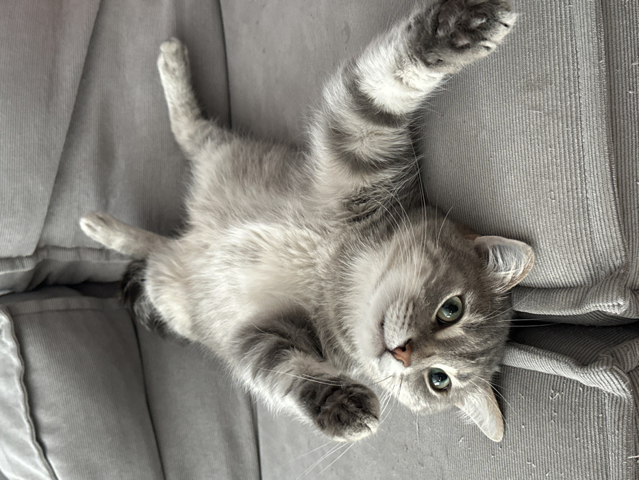 - "A gray and white tabby cat is positioned on its back, centered on a light gray, ribbed fabric sofa" by FM-3OYS02, licensed under CC BY 4.0