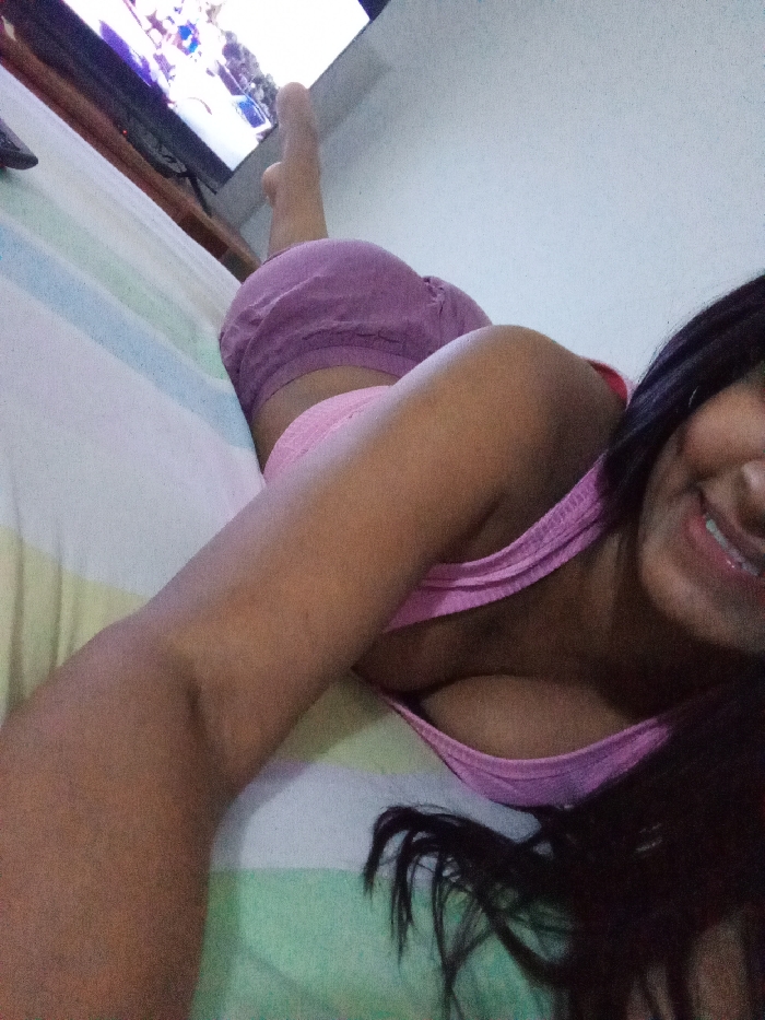 A woman lies on her side on a striped bed, watching television. She wears a pink tank top and purple shorts. Her head is tilted back, displaying a partial view of her face and a wide smile. One arm extends towards the camera. The television screen shows figures, possibly engaged in a sporting event. The background is a plain, light-colored wall.
