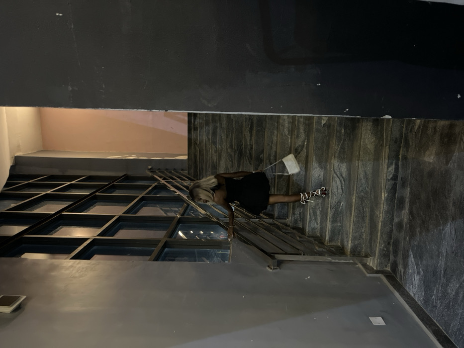 A blonde-haired individual, wearing a black strapless short dress and white lace-up high-heeled sandals, ascends a granite staircase. They hold a small white textured shoulder bag over their right shoulder and their right hand rests on a dark metal handrail. The individual's body is slightly turned, looking back over their left shoulder. To the left of the staircase is a large, multi-paned window with dark frames, reflecting ambient light. The adjacent walls are dark grey. A section of a light pink wall, illuminated from above, is visible at the top of the staircase. The specific location within the city of Barden Yana, Nigeria, is not discernible from the provided image. The scene depicts an interior, possibly a commercial or modern residential building, characterized by dim lighting.