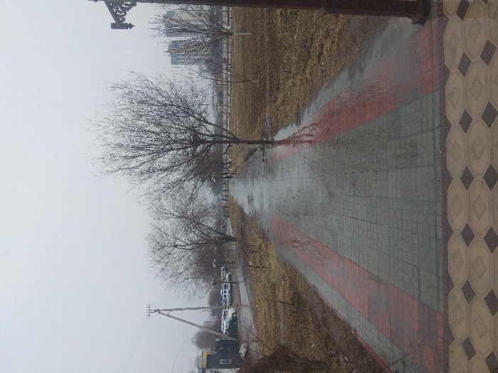 A horizontal shot of a wet brick path runs through a park on a dreary day. Bare trees line the path, and buildings are visible in the distance. The path is gray with red stripes. A patterned brick border is visible on the right. Bare grass is along the side of the path. Utility poles are visible in the distance to the left of the path.