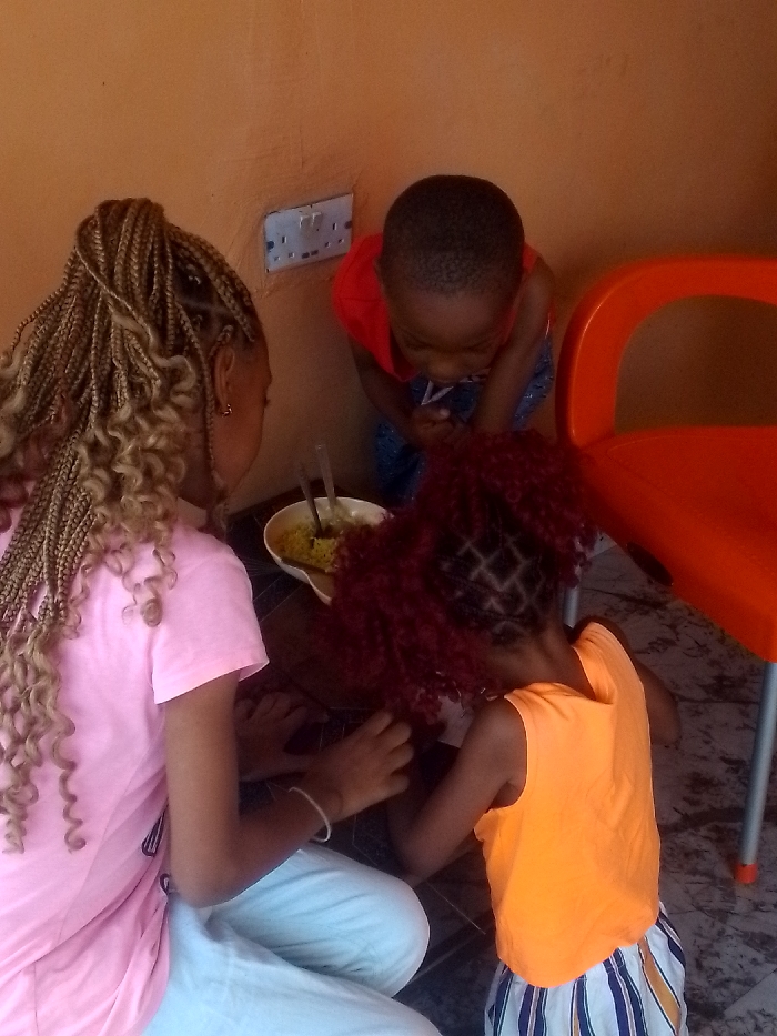 Three individuals are depicted indoors, gathered around a meal and an electronic device. On the left, an older individual with light blonde box braids, wearing a pink t-shirt and light blue trousers, is seated on a tiled floor. To their right, a young child with short dark hair, dressed in a red t-shirt and blue patterned shorts, stands or crouches, looking into a white bowl. The bowl contains a yellow rice dish with two silver utensils. To the right of the bowl, a second young child with dark red curly hair featuring a diamond-patterned braid, wearing an orange sleeveless top and striped white, blue, and yellow pants, is also seated on the floor. A black electronic device, appearing to be a laptop or tablet, is on the floor in front of the two seated individuals. The wall behind them is painted a solid orange color and features a white dual electrical outlet (Type G). The floor is tiled with a grey and black geometric pattern. An orange plastic chair with a silver metal frame is partially visible on the right side of the image. The location in the city of Unknown, Unknown, is indicated by an indoor room with specific architectural and electrical fittings.