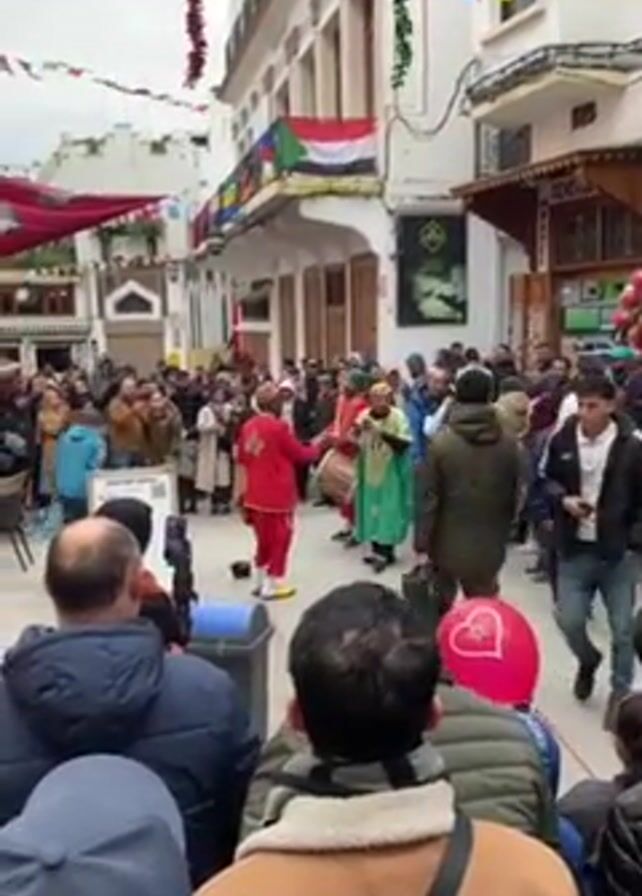 crowded street in what appears to be a town square. Several people are gathered to watch a performance. Two individuals are dressed in traditional costumes, one in red and the other in green, and appear to be dancing or performing to the accompaniment of a musician. The street is decorated with various national flags strung overhead. Buildings line the street, with shops and cafes visible. The crowd is diverse, with people of different ages and backgrounds. Several individuals are holding up phones to record the performance. There's a festive atmosphere.