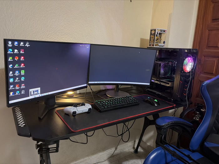 The image displays an indoor computer workstation situated in Icod de los Vinos, Spain. A black L-shaped or corner desk is the central feature, supporting a dual-monitor setup. The left monitor displays a desktop environment with numerous application icons and a red crosshair, while the right monitor presents a dark screen. A white PlayStation 5 DualSense controller rests on a black mouse pad with red stitching, positioned directly in front of a black gaming keyboard and a black Razer gaming mouse. To the right of the monitors, a black PC tower with a visible interior showcases components such as a CPU cooler and a "GeForce RTX" graphics card, illuminated by multi-colored RGB fans and lighting. A small, warm-toned lamp is visible beneath the left monitor. The background consists of a light-colored, textured wall. In the upper right corner, a yellow-themed Funko Pop figure is placed on a shelf. A brown wooden door is partially visible along the far right edge of the frame. A blue and black gaming chair is positioned at the desk, with its armrest prominent in the lower right foreground. No individuals are present in the scene.