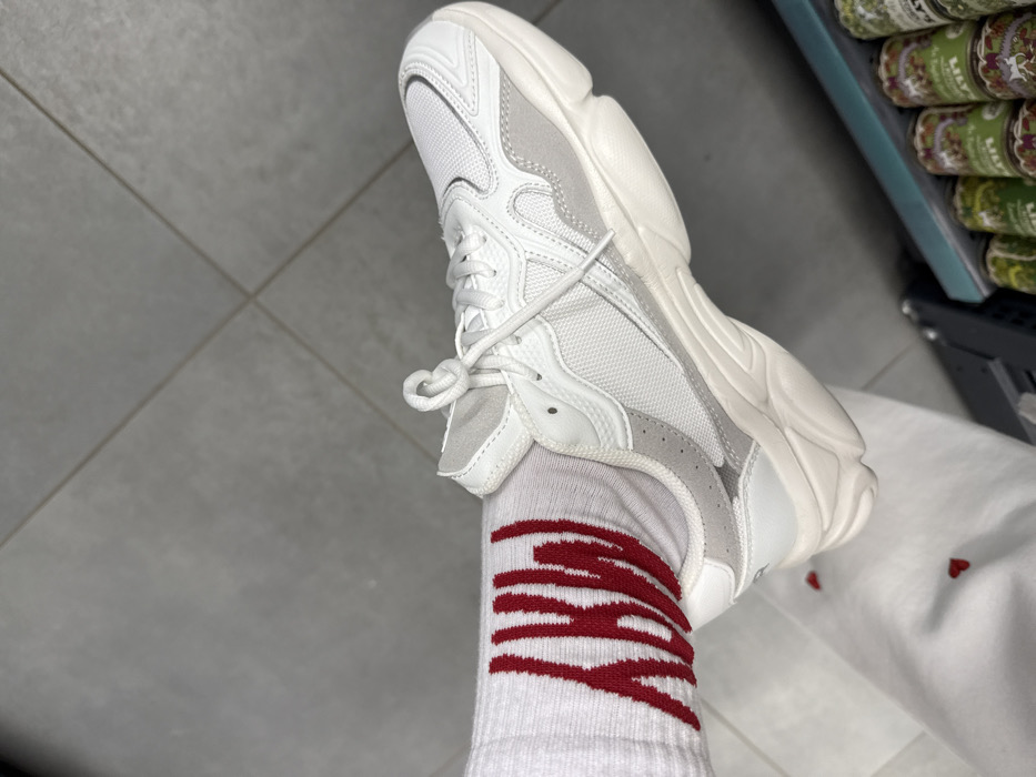 A left foot, positioned in the lower-left quadrant of the frame, wears a white athletic shoe with a thick, textured sole, white mesh and synthetic leather upper, and light grey suede accents; the white laces are tied