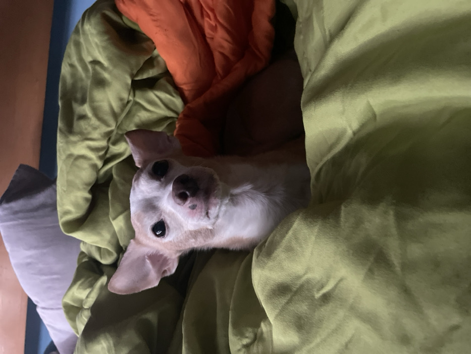 A small, short-haired dog, consistent with a Chihuahua breed, is positioned centrally in an indoor domestic setting, specifically a bed. The dog has tan fur on its body, with a white chest, muzzle, and forehead, and prominent erect ears. Its dark eyes are fixed forward, and its nose displays several small dark spots. It is partially enveloped by rumpled, light olive-green bedding that covers the lower portion of its body and extends to the left. To the dog's right, a textured, rumpled orange or rust-colored blanket is visible. In the background, behind the green bedding, a light grey or lavender pillow is partially discernable, with a dark blue surface, possibly a headboard or wall, above it. The lighting is soft and ambient. The image provides no visual identifiers to specify a particular location within Esch-sur-Alzette, Luxembourg.