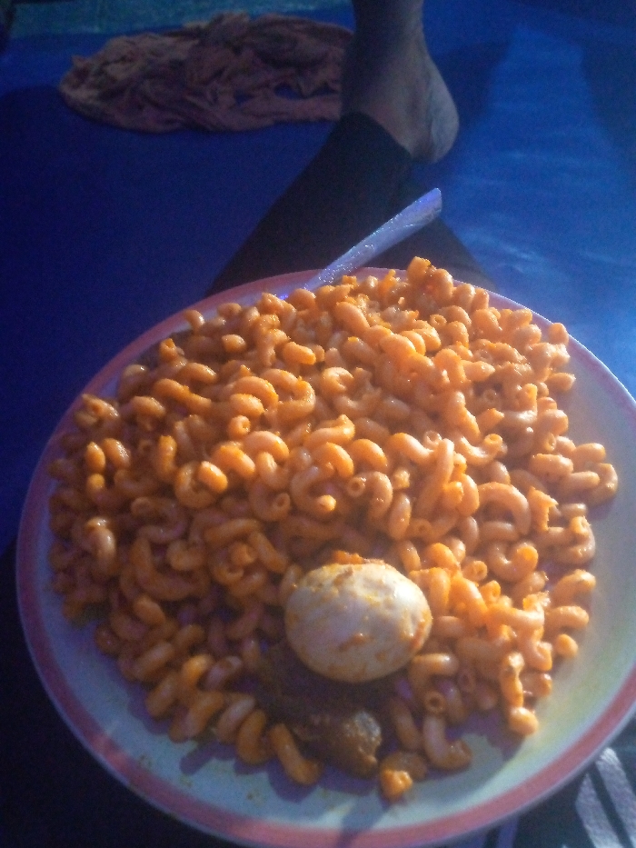 The image depicts a meal served in Iranla, Nigeria, from an elevated perspective. In the immediate foreground, a white circular plate with a red-orange rim holds a substantial portion of orange-colored macaroni pasta. A single, whole, light brown hard-boiled egg is centered towards the bottom of the pasta mound, partially obscuring a dark, irregular object believed to be a piece of meat. A translucent plastic spoon rests on the plate's rim, extending towards the upper left. Behind the plate, a bare, light-skinned foot and a portion of a leg clad in dark trousers are visible, indicating a seated individual. The entire scene is situated on a blue surface, likely a mat or floor. In the upper left background, a crumpled orange fabric item is visible. The lighting is dim with a cool blue hue.
