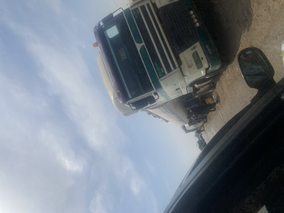 The image depicts a roadside scene in Gidan Waya, Nigeria, under a partly cloudy daytime sky. The view is captured from within a vehicle, with a dark door frame and a side mirror visible in the foreground. A white and teal DAF XF tanker truck, featuring a large, light-colored cylindrical trailer, is prominently positioned in the mid-ground, appearing stationary on a dirt or gravel shoulder adjacent to what appears to be a paved road. An orange warning light is visible on the cab's roof. Multiple individuals, dressed in dark clothing, are standing and congregating near the DAF truck and several other similar tanker trucks that are queued in a line extending into the distance along the road. The ground around the trucks shows patches of dirt and potentially damp areas.