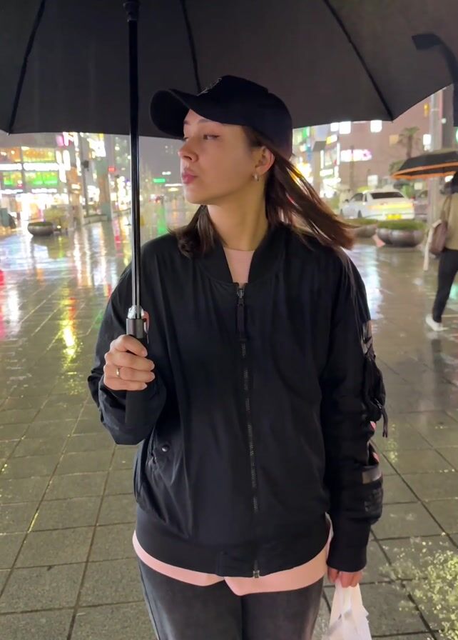 A young woman walks down a wet city street in the rain, holding a black umbrella. She wears a black baseball cap, a black jacket over a light pink shirt, and gray jeans. She also carries a white bag. The street is wet and reflects the neon city lights. Other people can be seen walking in the background with umbrellas. She smiles at the camera.