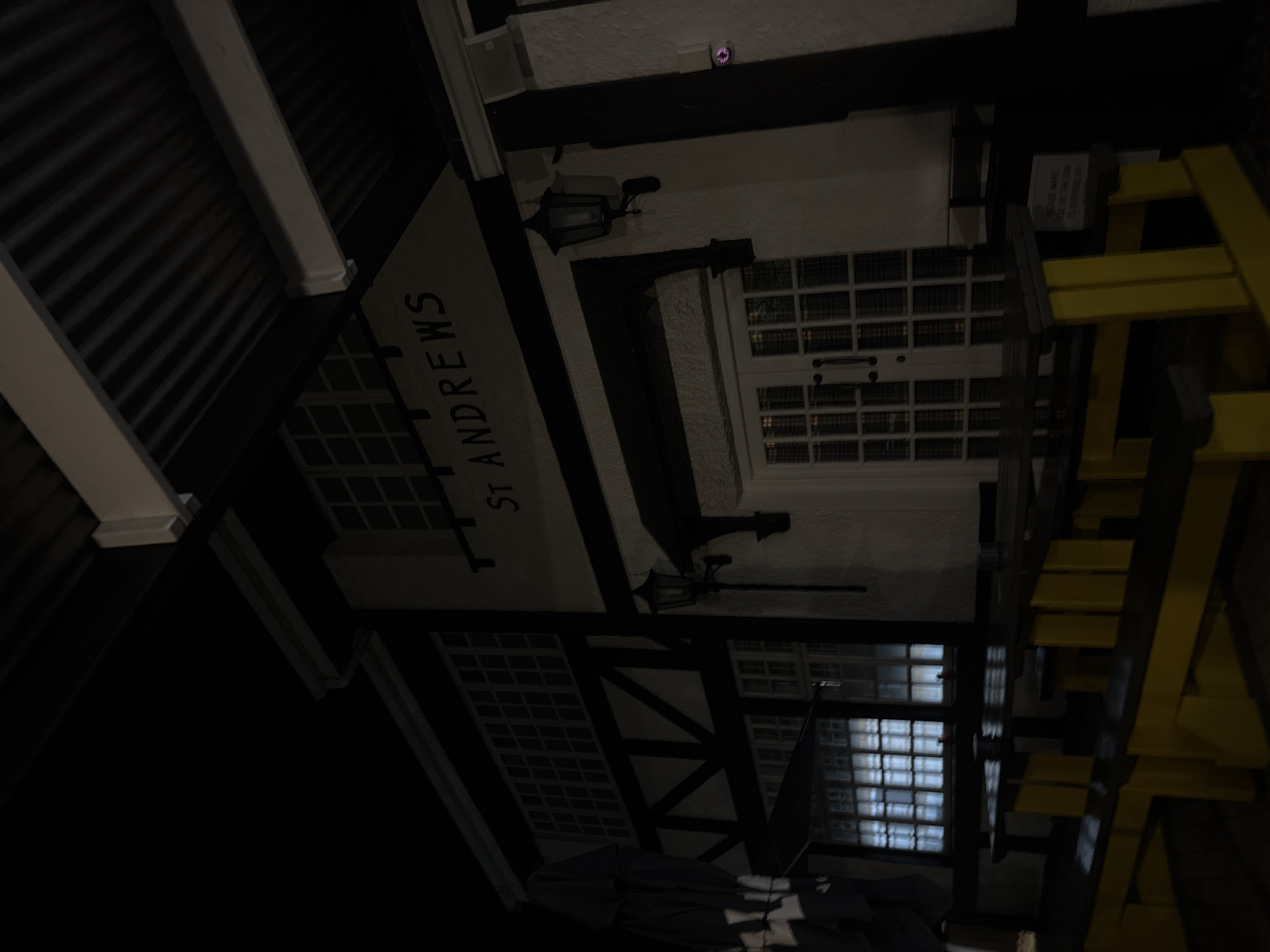 This nighttime image depicts the exterior of "ST ANDREWS" in Port Alfred, South Africa. The building exhibits a Tudor-style facade with white textured walls and dark horizontal and diagonal timber-like beams. A dark, corrugated metal roof extends over the structure. The name "ST ANDREWS" is displayed in dark capital letters on a light background above a central white double door entrance, which features multiple glass panes. Two black, wall-mounted lanterns illuminate the facade, positioned to the left and directly above the main doors. To the right of the entrance, a small security device or camera with a purple indicator light is affixed to the wall. In the foreground, an outdoor seating area is visible, consisting of multiple picnic-style tables with integrated benches. These tables feature bright yellow supports and dark-colored tops. To the far left, a large, dark patio umbrella is seen in a collapsed and tied state. A small white sign with dark text is partially visible near the tables on the right, displaying "PLEASE MAKE USE OF THE BIN" and "TO DISPOSE OF" with further text obscured. No individuals are present in the scene.