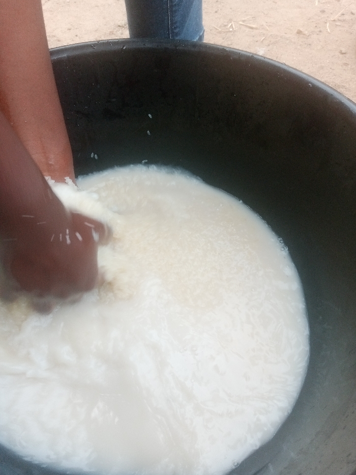 In Ajibade, Nigeria, two hands with medium-brown skin are observed inside a black, round plastic basin, engaged in washing a large quantity of raw white rice. The rice is submerged in a cloudy white liquid, likely water, filling approximately two-thirds of the basin. Individual grains of rice are visible floating and suspended within the liquid, and clinging to the hands. The hands are actively agitating the rice and water. In the background, out of focus, a portion of blue denim fabric (suggesting trousers) and light-brown, sandy ground are discernible.