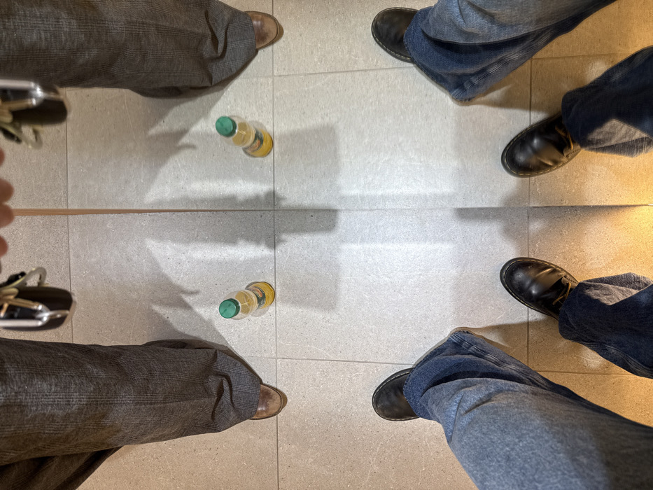 - "An overhead shot captures two pairs of legs and feet standing on a tiled floor with a reflective surface bisecting the image horizontally" by FM-MKhmN2, licensed under CC BY 4.0
