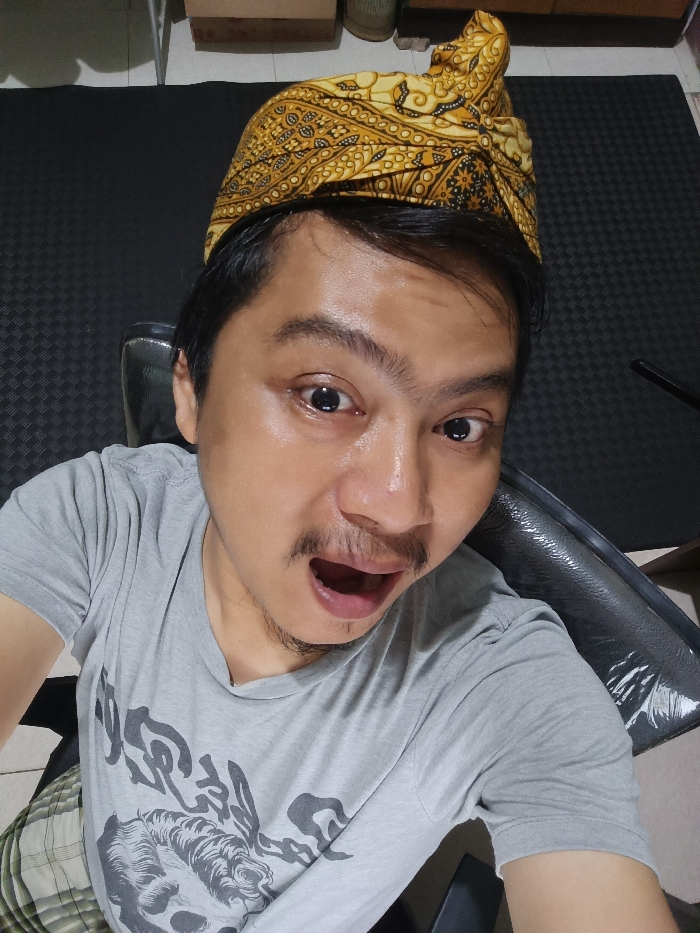 An adult male subject is depicted in a close-up, chest-up portrait, looking directly into the camera with wide eyes and an open mouth. He has a thin mustache and sparse chin hair. The subject wears a yellow-gold traditional Indonesian headwrap with intricate brown batik patterns. He is dressed in a light grey short-sleeved t-shirt featuring a dark graphic print on the front. A plaid or checked garment is partially visible around his waist. The subject is seated in a dark office chair. The background reveals a dark grey, textured floor mat and partially visible light brown objects, consistent with boxes or shelving, in the upper left quadrant. The scene is located in the city of Maleber, Indonesia.