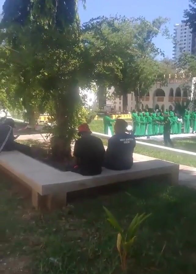 group of people dressed in green robes standing in a line in front of a building with arches, likely a school or government building. Two people are sitting on a bench in the foreground, watching the group. The scene takes place in a park-like setting with trees, grass, and walkways. It is a sunny day. The group in green appears to be performing or rehearsing something.