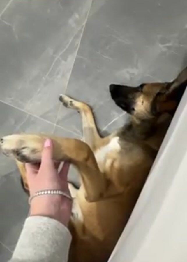 A woman's hand, adorned with a silver bracelet, holds the paw of a dog. The dog is lying on its back on a gray tiled floor, its body positioned near a white wall. The dog has a brown coat with a black muzzle and pointy ears. The woman's hand gently holds the dog's paw. The dog appears relaxed, with its eyes closed.