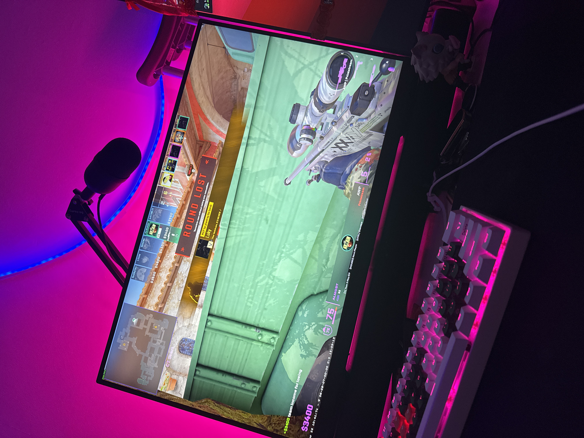 gaming setup, likely indoors. The monitor displays the game Valorant, with the "Round Lost" message visible. The player "ALMOST" has an AWP Printstream skin and 75 health points. The game interface shows team members' names, economy, and other in-game information. A microphone is positioned to the left of the monitor. To the right, a white mechanical keyboard with pink backlighting is visible. The background features pink and blue LED lighting. A small figurine is near the monitor. The OCR suggests the website "Gplay.bg," and a game server IP indicating that the location is most likely NOT Sofia, Bulgaria but a location where Counter-Strike: Global Offensive (CS:GO) or Valorant can be played, as the IP indicates a game server connection.
